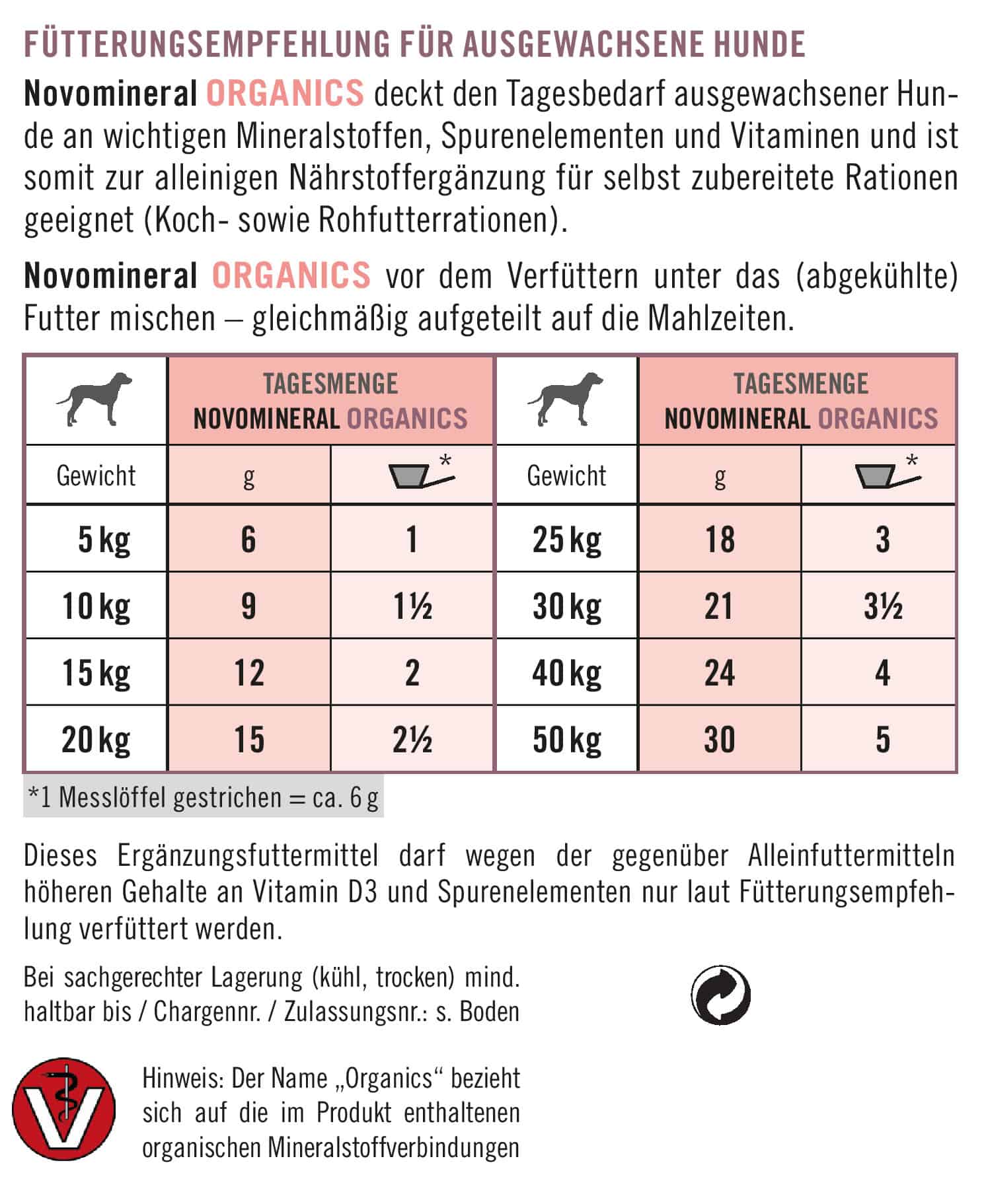 Nutzen Sie unseren kostenlosen Koch-Rechner auf “futter-rechner.de” für die individuelle Dosierung von “Novomineral ORGANICS” basierend auf dem Körpergewicht Ihres Hundes. Zusätzlich können Sie dort verschiedene Kochrationen selbst erstellen und erhalten hilfreiche Tipps zu Zutaten und Zubereitung.