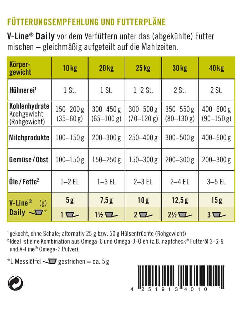 Fütterungsempfehlung für ausgewachsene Hunde: V-Line DAILY vor dem Verfüttern unter das (abgekühlte) Futter mischen – gleichmäßig aufgeteilt auf die Mahlzeiten.