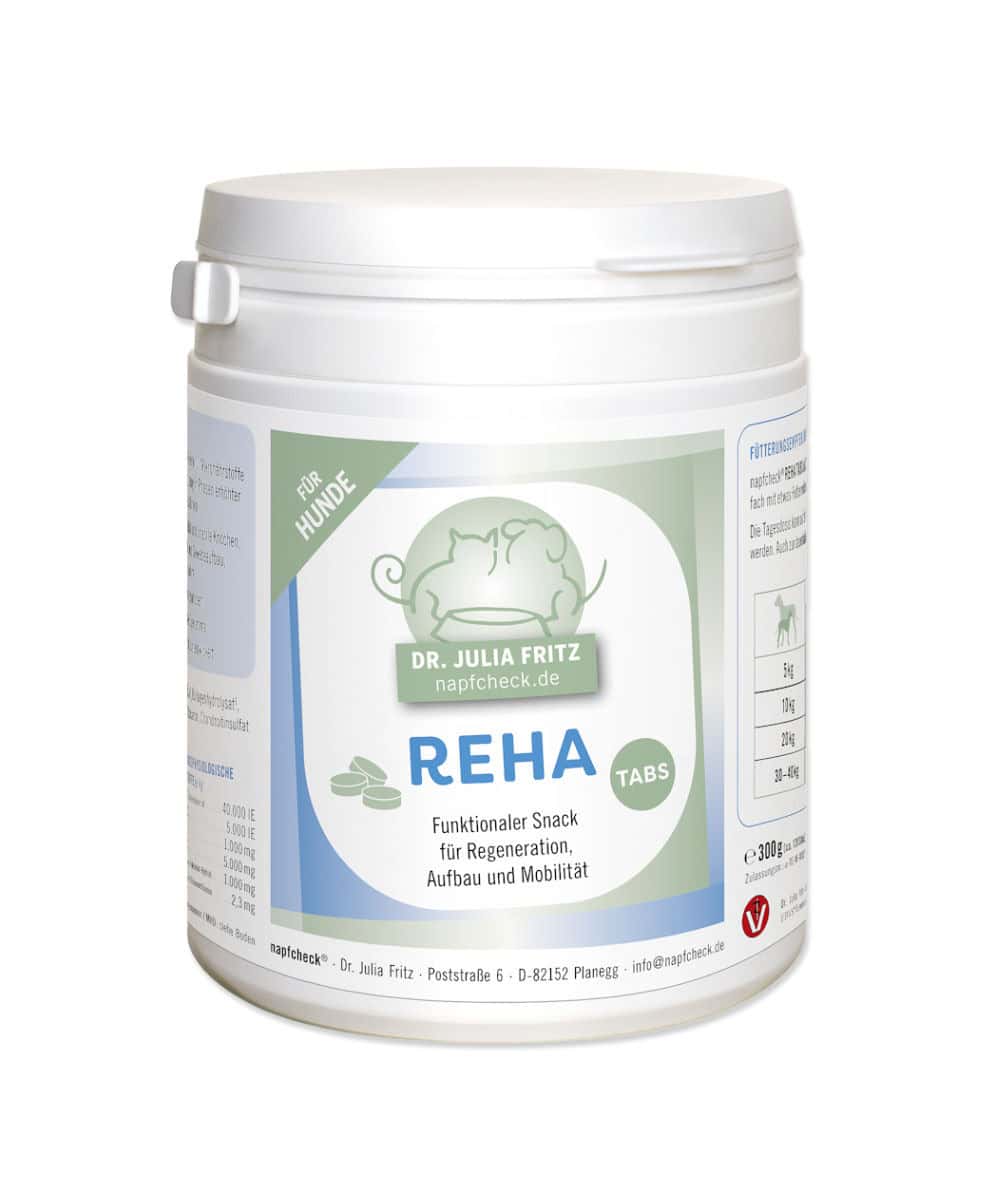 napfcheck REHA TABs enthalten viele wichtige Nährstoffe, zur Unterstützung Ihres Hundes insbesondere in Phasen erhöhter Belastung, nach Erkrankungen, Verletzungen oder Operationen sowie bei erhöhtem Bedarf an muskel- und gelenkunterstützenden Nährstoffen. Die napfcheck Reha Tabs eignen sich ideal während Rehabilitation- und Trainingsphasen sowie zum allgemeinen Aufbau als auch gezielten Muskelaufbau. Dank dem geschmackvollem Geflügelaroma sind die Reha Tabs besonders lecker und können auch als schmackhafter Snack gegeben werden.